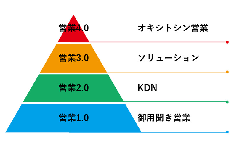 これは、サザエさんに出てくる三河屋の三郎さんの、「お醤油がそろそろなくなりそうだから、1本置いていきますね」と、お客様のニーズを先回りして聞くスタイルです。三郎さんはいつも家の中を見ているので、何がなくなっているかすぐにわかります。御用聞き営業のその心は、「顧客のニーズを的確に捉える」「顧客を知り尽くす」という点から考えれば、ある意味理想的な営業スタイルとも言えます。営業1.0とは、「御用聞き」を確実にやりきる営業スタイルです。実は、この営業1.0に届いていない営業職も多くいます。