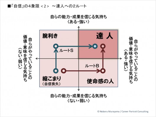 理想の境地〈達人〉に至るには2つのルートがある。ひとつめに、まず自信のベースを「能力・成果への自信」に置き(=「腕利き」となり)、そこから自分のやっていることへの価値や意味を見出していって〈達人〉に至る―――これがルートSである。